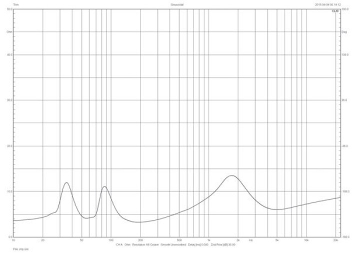 Ciekawy "antyrezonas" pojawia się przy 850 Hz, a więc w zakresie pracy nisko-średniotonowego. W drugą stronę charakterystyka przetwarzania zaczyna opadać już od 150 Hz, na szczęście początkowo z relatywnie małym nachyleniem, zwiększającym się dopiero poniżej 50 Hz, spadek -6 dB względem poziomu średniego mamy przy ok. 65 Hz.