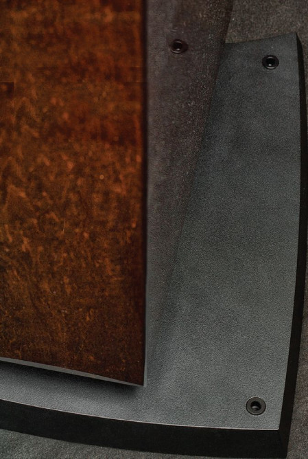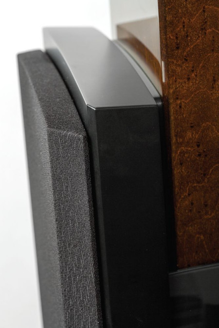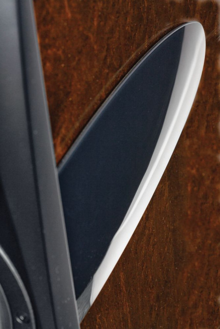 Wyprofilowanie frontowego panelu nie podąża idealnie symetrycznie za układem głośników (przewężenie przesunięte jest do dołu), co wygląda interesująco, ale ma również znaczenie akustyczne - chociaż teoretycznie "desymetryzuje" cały układ, to nieco różnicując warunki działania dla każdego głośnika określonej pary (czyli np. dolny wysokotonowy "widzi" wokół siebie nieco inne wyprofilowanie niż górny) wywołuje różne rozkłady odbić i nierównomierności od poszczególnych głośników, które ostatecznie uśrednią się w charakterystyce wypadkowej. Dogłębnie przemyślane i skorelowane z doskonałym wyglądem.