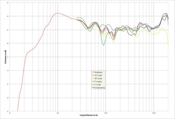 Wysokie tony w większej części prowadzone są na poziomie średnicy, a przy tym bardzo dobrze rozpraszane – nawet pod kątem 30 st. docierają na dobrym poziomie aż do 18 kHz. Przejście przez drugą częstotliwość podziału (3,3 kHz) jest płynne i niezależne od osi pomiaru. Ujawnia się jednak pierwsza częstotliwość podziału: na osi -7 st. pojawia się wąskopasmowe osłabienie przy 900 Hz, a najwyższy poziom, najlepiej skorelowany z sąsiednimi zakresami, uzyskujemy na osi +7 st.; lepiej więc usiąść w wyższym, niż niższym fotelu.