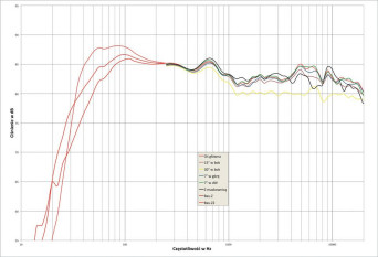 Włożenie pierścieni prowadzi do obniżenia częstotliwości rezonansowej do 32 Hz (impedancja - krzywa zielona), charakterystyka przetwarzania opada wcześniej, ale łagodniej, udaje się utrzymać spadek -6 dB przy 33 Hz, w tym miejscu krzywe się przecinają; dołożenie "korków" prawie dokładnie zamyka obudowę (odrobina ciśnienia wciąż się stamtąd wydobywa), na charakterystyce impedancji pozostaje już tylko jeden wierzchołek (przy 48 Hz, krzywa czarna), charakterystyka przetwarzania opada już na tyle wcześnie, że spadek -6 dB przesuwa się do 45 Hz - to raczej wariant awaryjny.