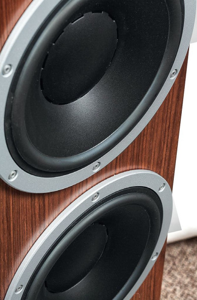 Głośniki niskotonowe mają cewki 75 mm, ich średnicę można zobaczyć z zewnątrz, ze względu na specjalny profil i technologię membrany - jest wytłaczana z jednego kawałka, a cewka jest dołączona na okręgu dzielącym profil membrany.