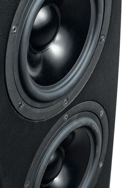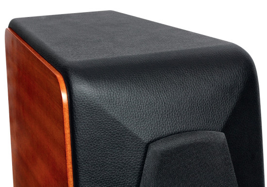Front obudowy ma grubość aż 40 mm i jest obleczony skórą (może sztuczną), której producent wcale nie przypisuje żadnych specjalnych zalet akustycznych, ale montażową - skóra jest od razu dobrą uszczelką dla wszystkich głośników. Ścianki boczne wykończono naturalnym fornirem w dwóch wersjach - wiśnia i mahoń.