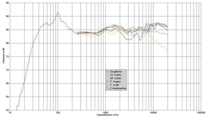 Wyrównanie zakresu średnich tonów jest wyśmienite, wysokie tony są na ich tle lekko wzmocnione (co często spotykane), chociaż już bardziej pofalowane - uwagę zwraca zwłaszcza lekki, ale skokowy spadek powyżej 10 kHz; to cecha samego berylowego tweetera, a nie jego filtrowania (zjawisko ma miejsce daleko od częstotliwości podziału). Do pewnego stopnia przebieg wysokich tonów możemy zmieniać zworą, pomiary wykazały, że w pozycji "plus" dodatkowemu wzmocnieniu ulega właśnie zakres 5-10 kHz, a najwyższe tony już nie, natomiast w pozycji "minus" obniżeniu ulega właśnie naj- wyższa oktawa; ostatecznie najładniejszy przebieg uzyskujemy w przedstawionej na rysunku pozycji neutralnej.
