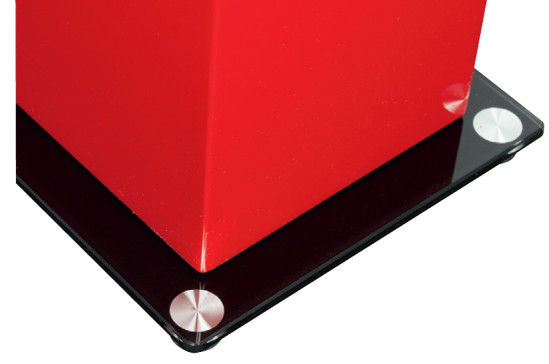 Dla ustabilizowania tak wąskiej obudowy, cokół jest niezbędny; to szklana płyta (polakierowana od dołu na czarno), adekwatnie delikatna do wyglądu całej bryły.