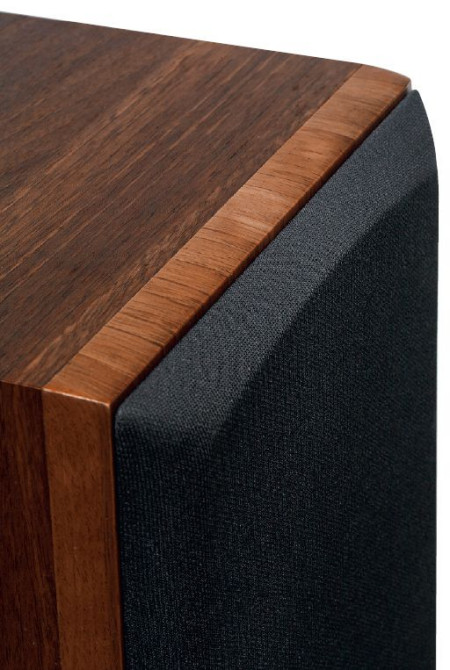 Maskownica jest trzymana przez klasyczne kołki, które lepiej wtapiają się w czarne, niż w orzechowe tło, na którym lepiej wyglądają też srebrzyste membrany i złota kopułka. Lubię okleinę orzechową, ale naturalną; w tym przypadku ciekawsza wydaje się wersja czarna.