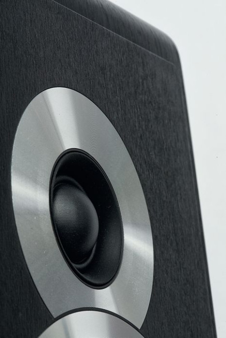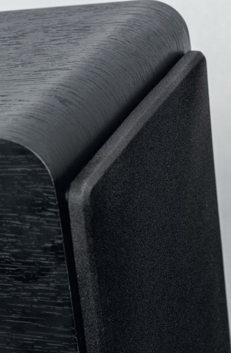 Front został pokryty cienką warstwą szczotkowanego i anodyzowanego (na czarno) aluminium, pozostałe ścianki wykończono czarną folią z delikatną fakturą drewna (black ash). Obudowa stoi na cokole, ze względu na jej pochylenie bardziej wystającym do tyłu, również w tym fragmencie nie dzieje się nic nadzwyczajnego. Zaokrąglenia poziomych krawędzi dodają za to delikatności - w przypadku górnej krawędzi, ze względu na bliskość wysokotonowego, może to mieć (pozytywne) znaczenie akustyczne.