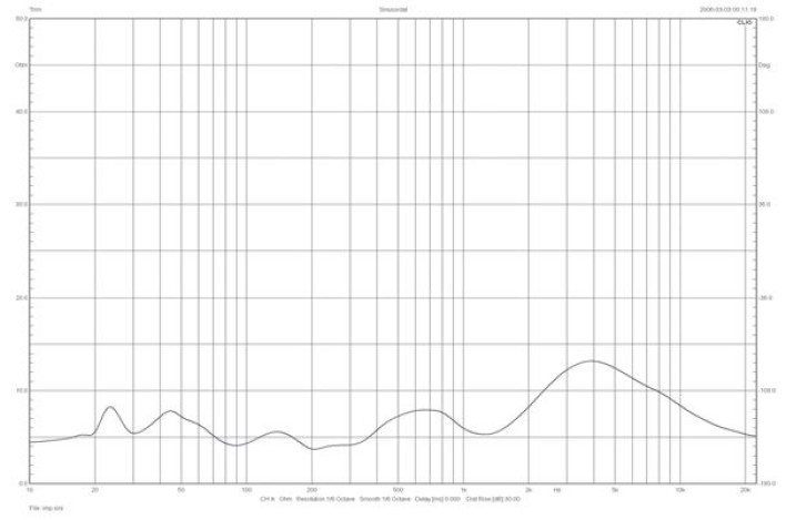 Charakterystyka impedancji jest nietypowa, "bogato" pofalowana na skutek działania wielu sekcji i rozbudowanych filtrów, jednak zmiany nie są gwałtowne, a ich zakres też umiarkowany (minimum ok. 3,5 Ω przy 200 Hz, maksimum 13 Ω przy 4 kHz), również zmienność w zakresie niskotonowym jest niewielka, stąd wzmacniacze nie powinny mieć z tym obciążeniem kłopotu, mimo że znamionowo jest ono 4-omowe (co producent uczciwie stwierdza).