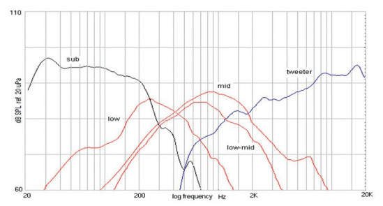 Producent klasyfikuje swoją konstrukcję jako 5-drożną, podając cztery konkretne częstotliwości podziału (240/500/1250/1850 Hz), ale uwzględniając przebieg pokazanych charakterystyk, można układ nazwać czteroipółdrożnym (charakterystyki głośników "low-mid" i "mid" są zróżnicowane w podobny sposób, jak w układzie dwuipółdrożnym); 1250 Hz jest częstotliwością przecięcia charakterystyk głośnika "low-mid" i wysokotonowego, ale wysoko ponad tym przecięciem leży charakterystyka głośnika "mid". Za częstotliwości podziału nie będziemy przecież uważać (i konstruktor też nie uważa) każdego przecięcia charakterystyk, których to przecięć jest znacznie więcej (np. "sub" i "mid" przy 300 Hz), a tylko te, które leżą powyżej innych charakterystyk. Zwracają uwagę blisko położone częstotliwości podziału i łagodne zbocza (w sąsiedztwie częstotliwości podziału), z wyjątkiem bardziej stromo filtrowanej sekcji "sub". Jak jednak wskazuje znany nam schemat zwrotnicy (opublikowany przez włoskie "Audio"), wszystkie filtry są elektrycznie 2. rzędu. Domeną sekcji "low" jest wąski zakres pomiędzy częstotliwościami podziału 240 Hz i 400 Hz (producent podaje 500 Hz, ale to się nie zgadza z jego własnymi rysunkami), a gdyby zsumować charakterystyki obydwu głośników średniotonowych, ("low-mid i "mid"), to formalny podział z "low" (przecięcie charakterystyk) przesunąłby się nawet do ok. 300 Hz; mimo to sekcja "low" pełni ważną rolę, zarówno wypełniając lukę między średniotonowymi a "sub", jak też współpracując z sąsiednimi sekcjami w szerszym zakresie (łagodne zbocza), również dla efektu "dekorelacji" (zredukowania fal biegnących pod większymi kątami i wywołującymi odbicia od sufitu i podłogi). Praca pary średniotonowych pozwala zarówno na zawężenie charakterystyki kierunkowej w płaszczyźnie pionowej (z czym jednak konstruktor nie chciał przesadzić, filtrując niżej głośnik oddalony od wysokotonowego), jak i zwiększyć moc tej sekcji. Niski podział i łagodne zbocze (aż do 500 Hz) głośnika wysokotonowego świadczy o jego wysokiej wytrzymałości.