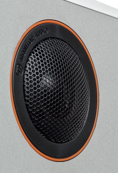 Aluminiowa kopułka wysokotonowa jest zwykle w kolumnach Monitor Audio eksponowana jasnym kolorem; tym razem pozostaje w cieniu - anodyzowana na czarno i zasłonięta siatką ochronną.