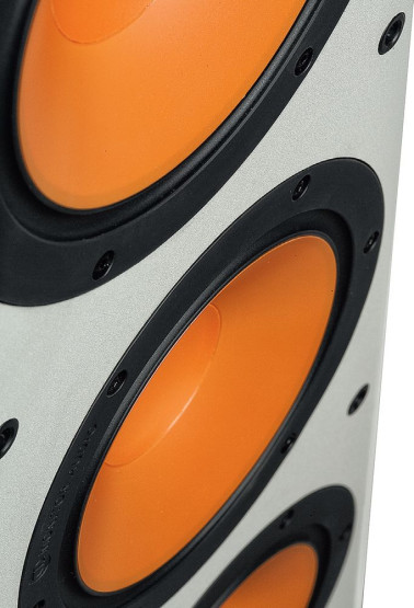 Efekt robią przede wszystkim membrany w kolorze pomarańczowym, wyglądające po prostu fajnie na każdym tle, jakie zostało tutaj przewidziane. Do wyboru są trzy wersje: w całości biała (w teście), czarna z ciemnoszarym frontem, i w orzechowej folii drewnopodobnej - też z ciemnoszarym frontem; niedociągnięciem jest komplet (aż dziesięć) gniazd na kołki maskownicy, zakłócających czystość białego frontu (w pozostałych wersjach nie będą się aż tak rzucać w oczy).
