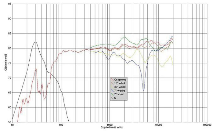 Charakterystyka impedancji znowu wymaga przypomnienia, że nie został przez nas podłączony filtr górnoprzepustowy, i widzimy "gołą" impedancję całego zespołu, na którą jednak wpływ subniskotonowej sekcji aktywnej jest pomijalny (bardzo wysoka impedancja wejściowa). Po podłączeniu filtra, w zakresie niskotonowym impedancja miałaby jeszcze wyższą wartość niż widoczna w naszym pomiarze, a już tutaj minimum przy 200 Hz ma wartość 9 omów!