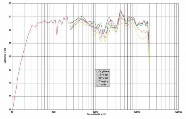 Co ciekawe, producent w ogóle nie wychyla się z deklaracjami co górnej granicy przetwarzanego pasma. Oś główna była ustalona na wysokości 100 cm, siedząc jeszcze wyżej pozostajemy "pod wrażeniem" wzmocnienia przy 4 kHz, natomiast trochę niżej poziom w tym zakresie przyjemnie spada, za to trochę lepiej wypełnia się zakres 500 Hz - 1,5 kHz.