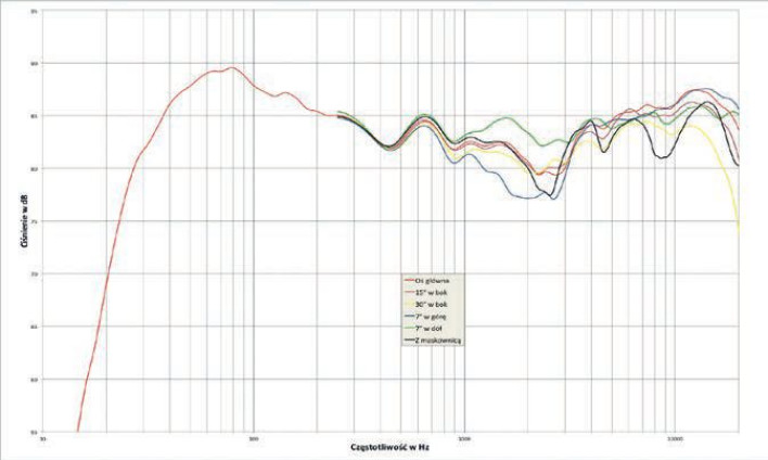 Wstęgowy zapewnia lepsze charakterystyki kierunkowe? Swoją drogą, tylko w płaszczyźnie poziomej; w pionowej będą nawet gorsze, ale... pod kątem 30O w płaszczyźnie poziomej, na samym skraju pasma, przy 20 kHz, gdzie wstęgowy powinien się "wykazać”, charakterystyka wyraźnie opada - podobnie, jak charakterystyka samej kopułki w modelu Spektor 6 (to kolumna tania, więc nie ma hybrydowego modułu wysokotonowego).
