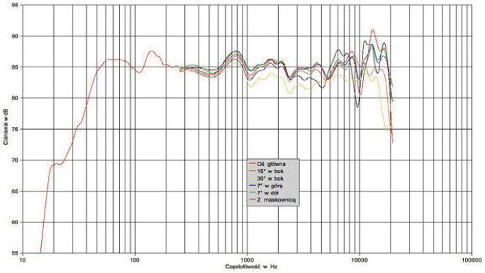 Wszystkie charakterystyki - mierzone pod różnymi kątami - leżą blisko siebie, dopiero na osi 30° widać stały spadek poziomu w zakresie średniowysokotonowym, ale charakterystyka zachowuje adny kształt. Najwięcej perturbacji wprowadza maskownica, więc wypada ją zdjąć. W zakresie niskich częstotliwości spadek 6 dB względem średniego poziomu notujemy nieco powyżej 40 Hz - zasięg basu jest więc całkiem dobry, mimo że nie zachodzi jego wyeksponowanie.