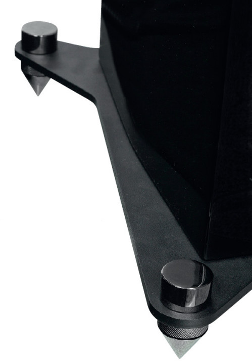 Dodatkowo front jest wzmocniony płytą aluminiową, elegancko zakrywającą kosze głośników, a ponadto pełniącą rolę akustyczną - jej wyprofilowania wokół głośników tworzą lepsze warunki do rozpraszania. Kolejna płyta znajduje się na dole - nieco wychodzi poza obrys właściwej obudowy, aby szerzej rozstawić punkty podparcia, jest przykręcana przez samego użytkownika i sama waży ładnych kilka kilogramów (jest stalowa). Wkręcane w nią kolce są odpowiednio potężne - tak jak chyba wszystko w tej konstrukcji.