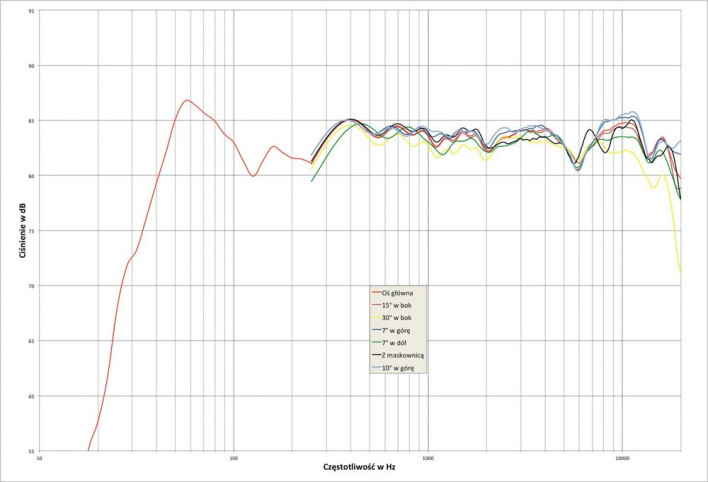 Wykonaliśmy dodatkowy pomiar, oznaczony "10º w górę", pokazujący charakterystykę na osi układu, ale nie ma potrzeby, aby rekomendować taką pozycję słuchacza względem kolumn – w praktyce wszystkie charakterystyki, z wyjątkiem zdjętej pod kątem 30º (w płaszczyźnie poziomej), leżą bardzo blisko siebie, włącznie z charakterystyką właściwą dla założonej maskownicy (na osi głównej).