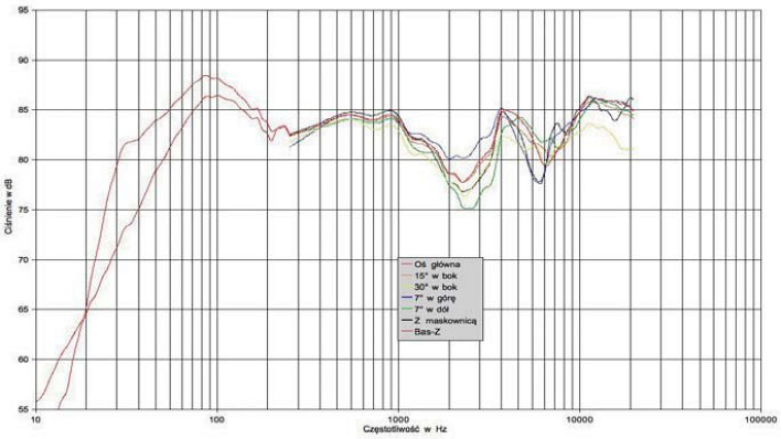 Charakterystyka przetwarzania jak zwykle pokazywana jest za pomocą całej rodziny krzywych w zakresie powyżej 250 Hz (dla różnych osi), tym razem również poniżej 250 Hz mamy więcej niż jedną charakterystykę, gdyż pokazane są wyniki pomiarów zarówno dla obudowy zamkniętej (zatyczka na wyposażeniu), jak i przy pracującym bas-refleksie - wtedy mimo szczytu leżącego dość wysoko, przy 80 Hz, i następującego poniżej spadku, punkt -6 dB względem średniego poziomu w całym pasmie (umiarkowana efektywność 85 dB) pojawia się bardzo nisko - poniżej 30 Hz.