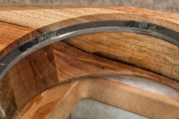 Zbliżenie na przekrój przedniej ścianki w otworze górnej 16-ki, w tym miejscu front ma grubość ok. 7 cm. Wewnętrzną krawędź tylko lekko sfazowano. Teoretycznie przydałoby się wykonać większe wyprofilowanie, aby zlikwidować "tunel", jednak nie było na to miejsca – osłabiłoby połączenie z bocznymi ściankami.