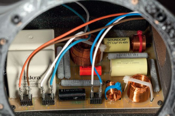 Zwrotnice Sonusa już dawno "pożegnały się" z minimalizmem; dzisiaj są tak rozwinięte, jak to konieczne, aby uzyskać wyrównane charakterystyki układów wielodrożnych. Sekcja niskotonowa najprawdopodobniej jest podłączona przez filtr 3. rzędu (na jego rzecz pracują m.in. dwie duże cewki), na tej samej płytce znajduje się też obwód RLC linearyzujący impedancję w zakresie niskich częstotliwości (górnego wierzchołka bas-refleks) - jego cewkę widać pośrodku, nieco z tyłu.