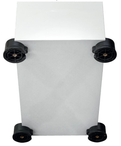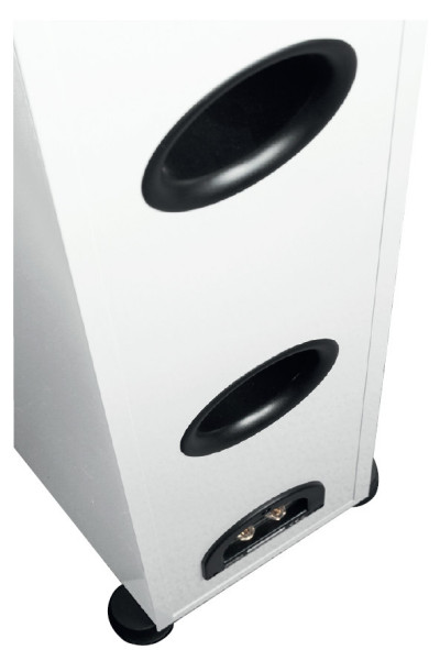 Cztery nóżki delikatnie wychodzą poza obrys obudowy - przy takiej sylwetce to konieczne, aby uzyskać choćby dostateczną stabilność. Głośnik średniotonowy ma własną komorę, a wszystkie trzy niskotonowe - wspólną. Z tyłu wyprowadzono dwa tunele bas-refleks, każdy o średnicy 7 cm i długości 11 cm. Oczywiście w ten sposób powstaje jeden układ rezonansowy (obudowy), o jednej częstotliwości rezonansowej, określonej przez objętość obudowy, łączną masę powietrza w tunelach i łączną powierzchnię otworów.