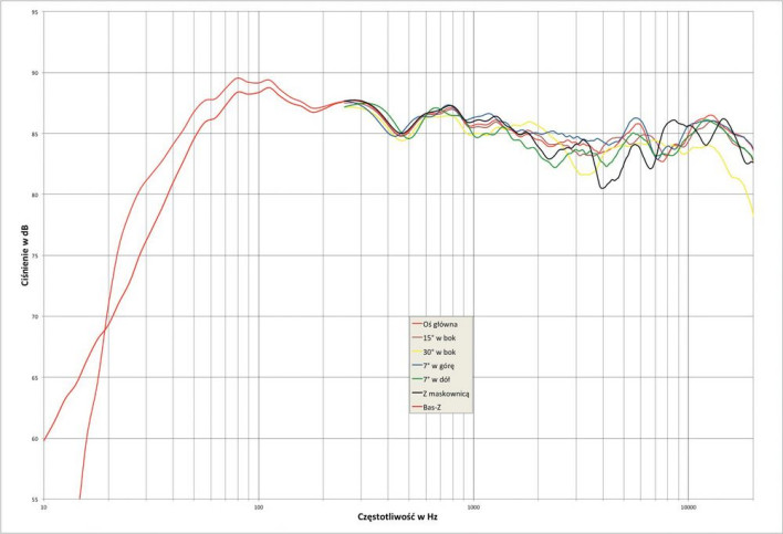Charakterystyka z osi głównej i z osi +7O mieści się w ścieżce +/-3 dB (pod warunkiem zamknięcia obudowy), od 42 Hz do... dokładnie nie wiemy, bo nasz pomiar kończy się przy 20 kHz, ale jeżeli powyżej ma dalej tendencję do opadania, którą widać już przed tą granicą, to właśnie do 20 kHz.