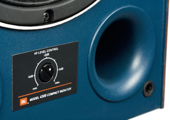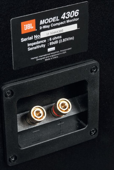 Swoją drogą, JBL 4306 wygląda jak "przeskalowany w dół" model 4367, podobieństwo widać również w lokalizacji tuneli bas-refleks, a zdejmowana maskownica nie obejmuje przetwornika tubowego. W dolnej części frontu, pomiędzy tunelami, umieszczono obrotowy regulator poziomu wysokich częstotliwości. Gniazdo przyłączeniowe jest pojedyncze.
