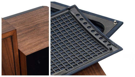 Większa część obudowy JBL 4306 jest wykończona naturalnym fornirem (orzechowym), ale gdy zdejmiemy maskownicę, zobaczymy nie tylko oryginalną, białą membranę nisko-średniotonowego, ale też niebieski front (wraz z tunelami bas-refleks) - to również nawiązanie do konstrukcji JBL-a z lat 70. Dostajemy więc spory zestaw cech technicznych i estetycznych, ściśle związanych z firmową tradycją.