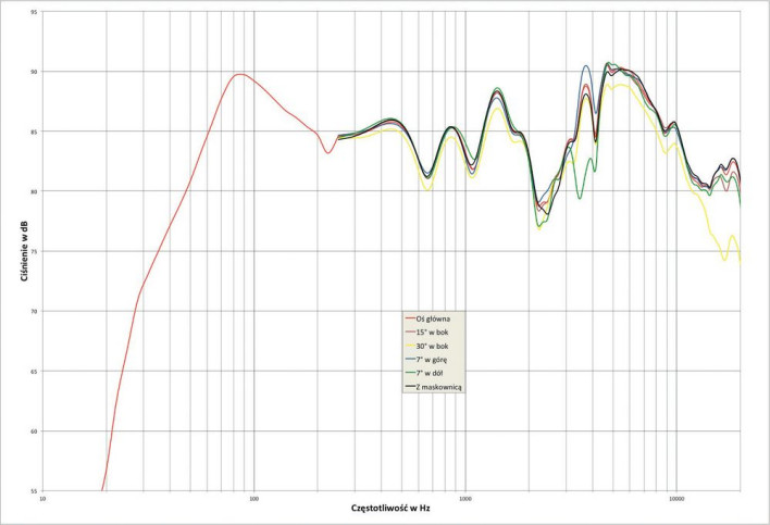 Laboratorium Dla uchwycenia charakterystyki potrzebna szeroka ścieżka (+/-5 dB), wzmocnienie przy 5 kHz, powyżej już wyraźny spadek, ale dobre charakterystyki kierunkowe. Czułość 87 dB przy impedancji znamionowej 8 Ω - łatwe obciążenie.