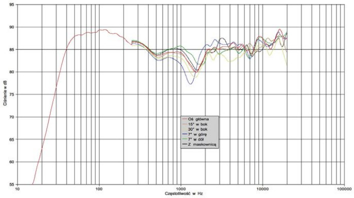 Z wyznaczonego pola tolerancji wymyka się przede wszystkim osłabienie przy 1,5 kHz, które pogłębia się i przesuwa w dół na osi +7° w płaszczyźnie pionowej - nie należy więc siedzieć zbyt wysoko, z głową powyżej 1 metra; na osi -7° zakres 1-2 kHz wypełnia się lepiej, nie wywołując innych skutków ubocznych - można więc spróbować pochylić lekko kolumny do tyłu. Maskownica, która pełni w Pardigmie szczególną rolę "wyrównywacza" frontu, nie wyrównuje jednak charakterystyki, ale też jej nie psuje - pojawia się inny przebieg drobnych nierównomierności i lekkie tłumienie tonów wysokich. Z maskownicami założonymi lepiej więc trzymać się blisko osi głównej, chociaż obniżenie na osiach 15° i 30° w płaszczyźnie poziomej jest wyjątkowo małe - procentuje dobre rozpraszanie z wąskiego frontu i właściwości samego głośnika wysokotonowego.