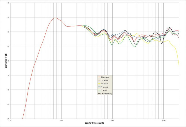 Charakterystyki z osi głównej, z osi +7º i 15º można zmieścić w ścieżce +/-3 dB od ok. 100 Hz, i w ścieżce +/-4 dB od 45 Hz. Sam zakres średnio-wysokotonowy, od 300 Hz, zmieścimy w ścieżce +/-2 dB. Charakterystyka na osi -7º jest obniżona i bardziej pofalowana w zakresie 800 Hz - 3 kHz, co na pewno ma związek z łączeniem poszczególnych sekcji i występującymi pod tym kątem przesunięciami fazowymi. Oś główną pomiaru ustaliliśmy na wysokości 90 cm (pomiędzy średniotonowym a wysokotonowym).