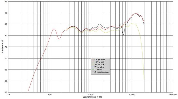 Wystarczy stwierdzić, że ta konstrukcja została zaprojektowana nie tylko przez designera, ale i przez profesjonalnego akustyka. Nie kłóci się z tym wyeksponowanie tonów wysokich, które po pierwsze, rodzi się już z właściwości samego przetwornika wysokotonowego (choć uzbrojenie go w tubkę z pewnością ma na to wpływ), a po drugie, pojawia się dopiero powyżej 8 kHz, więc nie będzie agresywne, a doda blasku i powietrza. Efekt ten można zresztą zmniejszyć poprzez ustawienie kolumn pod kątem 30°; z kolei maskownica ma tylko delikatny wpływ, wprowadzając wąskie osłabienie przy 6 kHz. Mamy umiarkowaną efektywność - 84 dB - lecz z takiego słupka naprawdę trudno wycisnąć więcej.