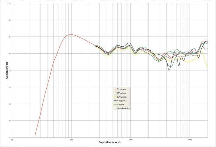 Charakterystyki w umiarkowanym stopniu rozchodzą się w sąsiedztwie (powyżej) częstotliwości podziału (wg danych producenta 2,3 kHz), ale już w innym "kierunku" niż w Ariach 906 – teraz osłabienie pojawia się pod kątem +7º (w górę), a najwyższy poziom pod kątem -7º (w dół), czyli podobnie jak Premier 200B.