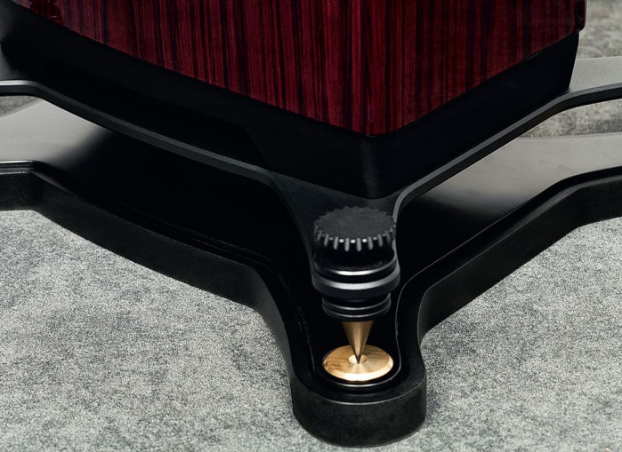 System bas-refleks ma wylot wyprowadzony przez dolną ściankę i specjalnie uformowany cokół rozprowadzający ciśnienie na boki.