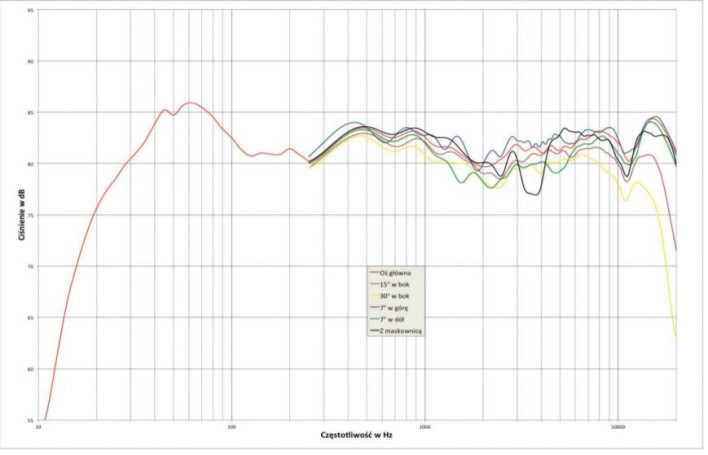 Po oględzinach maskownicy niczego dobrego się po niej nie spodziewaliśmy, wprowadza wyraźny dołek w zakresie 3–4 kHz, na pewno należy ją zdjąć. Jeszcze na moment przenieśmy się do zakresu niskich tonów, aby odczytać spadek -6 dB względem średniego poziomu – pojawia się przy 25 Hz, to fantastyczny wynik dla kolumny pasywnej.