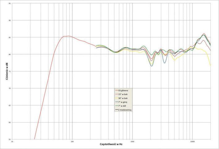 Charakterystyka z osi głównej mieści się w ścieżce +/-3 dB w zakresie 49 Hz - 20 kHz, a pewnie i wyżej, przy granicznych w naszym pomiarze 20 kHz mamy jeszcze "zapas", jeżeli opada powyżej z takim samym nachyleniem, to osiąga ok. 28 kHz. Producent podaje jeszcze szersze pasmo: 41 Hz – 50 Hz, powołując się na normę IEC 268-5; przy 41 Hz mamy jednak już ok. 10 dB spadku względem poziomu średniego.