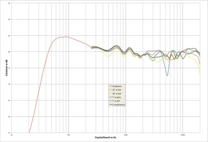 Charakterystykę z osi głównej, od 250 Hz, można zmieścić w ścieżce +/-2 dB, a wszystkie, włącznie z charakterystyką pod kątem 30O, do 15 kHz, w ścieżce +/-3 dB. Producent deklaruje przetwarzanie 45 Hz - 20 kHz w ścieżce +/-2 dB, ale dla takiego "pełnego" pasma potrzebujemy ścieżki +/-3 dB, ze względu na wzmocnienie niskich częstotliwości.