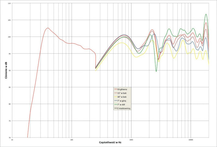 Teoretyczne przesłanki są następujące: na osi -7º (która w naszym pomiarze była najbliżej osi przetwornika wysokotonowego), a więc gdy usiądziemy z głową nieco poniżej 100 cm, odbierzemy charakterystykę pokazaną kolorem zielonym, ze spodziewanym najwyższym poziomem wysokich tonów. Osłabienie przy 2,6 kHz ("namierzające" częstotliwość podziału przy dużym przesunięciu fazowym na tej osi) jest tak wąskopasmowe, że nie będzie miało praktycznie żadnego brzmieniowego znaczenia.