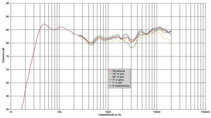 Z kolei charakterystyka z nieco większej wysokości leży bardzo blisko przebiegu z osi głównej. Wysokie częstotliwości są delikatnie wyeksponowane, ładnie doprowadzone do granicy naszego pomiaru przy 20 kHz (czy sięgają obiecywanych przez producenta 50 kHz, nie możemy sprawdzić, ale nie jest to wykluczone) są także doskonale rozpraszane - podobnie jak w Elacu, tweeter X-ART (lub JET) spisuje się doskonale. Efektywność jest umiarkowana - 84 dB.
