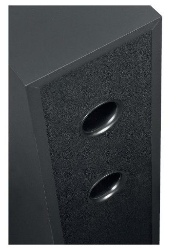 Z tyłu widzimy dwa tunele bas-refl eks ustawione mniej więcej (ale nie dokładnie) na wysokości przetworników nisko- -średniotonowych. Można by pomyśleć, że przygotowano dla nich niezależne komory, ale obydwa pracują w jednej, więc układ bas-refl eks, mimo że "dwutunelowy", jest dostrojony do jednej częstotliwości rezonansowej.