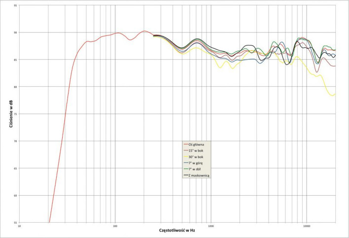 Po pierwsze, rzadko zdarza się widzieć w pracy układu symetrycznego tak dobrą stabilność charakterystyk w zakresie częstotliwości podziału (i poniżej); oś główną pomiaru ustaliliśmy na wysokości 80 cm, a więc 10 cm powyżej centrum akustycznego (głośnika wysokotonowego), a mimo to nawet pod kątem +7º (w stosunku do osi konstrukcji będzie to kąt prawie dwa razy większy), charakterystyka wygląda doskonale (krzywa niebieska); pod kątem -7º, a de facto blisko osi głównej, jest jeszcze lepsza (krzywa zielona).