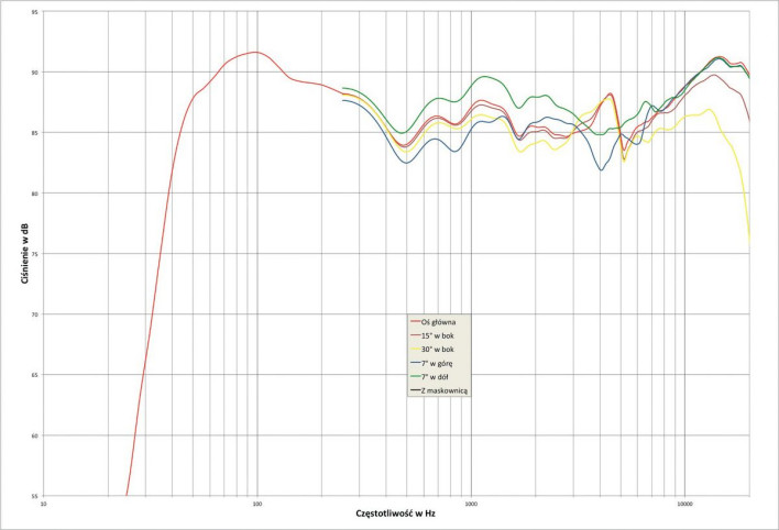 Charakterystyka z osi głównej leży niżej, ale może takie były zamiary, aby cofnąć szeroki zakres średnich częstotliwości. Charakterystyka z osi +7º biegnie jeszcze niżej, co raczej nie jest już efektem zamierzonym, chociaż przewidywalnym przy tak dużym rozsunięciu obydwu głośników nisko-średniotonowych. Dolny z nich jest filtrowany niżej, ale tłumienie większe od 6 dB osiąga dopiero powyżej 700 Hz.