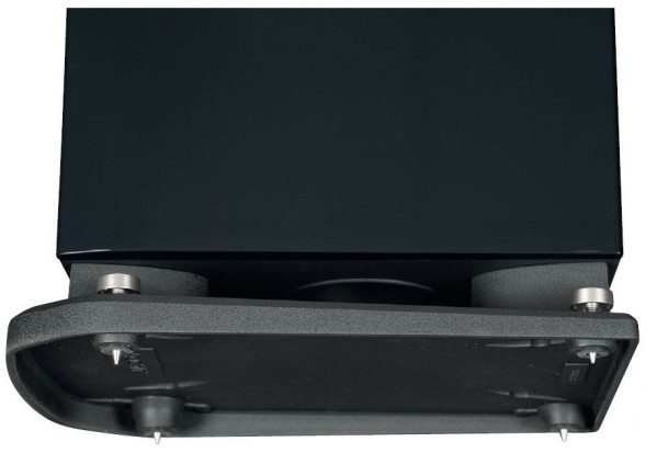 Front, tak jak wcześniej, pokryto imitacją skóry, a górną ściankę – taflą szkła. Na tym nie koniec materiałowego zróżnicowania, jest jeszcze cokół: solidny, odlewany, razem z nóżkami łączącymi go z obudową (i chowającymi się w jej cieniu), które pozwalają wydostać się (na wszystkie strony) ciśnieniu z otworu bas-refleks, ulokowanego na środku dolnej ścianki.