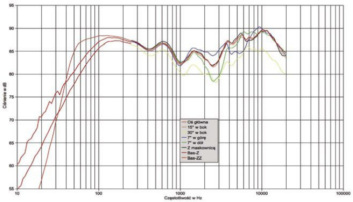 Co prawda na żadnej osi nie zmieścimy się w deklarowanej przez producenta ścieżce +/-3dB (dla pasma 49 Hz - 28 kHz), rozpiętość między dołkiem przy 1 kHz a górką przy 10 kHz wynosi 7 dB, ale niewiele brakuje. Po osiągnięciu szczytu przy 10 kHz charakterystyka zaczyna opadać, nie ukazując w tym momencie wielkich zalet diamentowej kopułki, chociaż rozpraszanie jest bardzo dobre - od peletonu odstaje dopiero krzywa zmierzona pod kątem 30O, ale i na niej stromość spadku między 10 kHz a 20 kHz nie zwiększa się, za to obniżony jest już poziom w zakresie średnich częstotliwości.