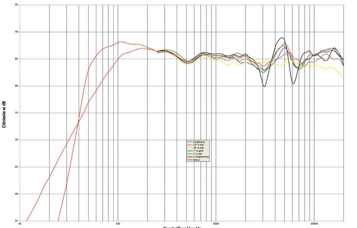 Różnice między pozostałymi nigdzie nie przekraczają 2 dB, taka zbieżność bez zastosowania układu koncentrycznego to rezultat wyśmienity, zwykle charakterystyki z osi +/-7º rozchodzą się bardziej przy częstotliwości podziału.