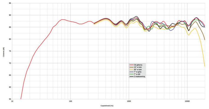 Nie trzeba natomiast pilnować wysokości miejsca odsłuchu, charakterystyki z osi +/-7º niemal sinie różnią, a często w okolicach częstotliwości podziału rozchodzą się znacznie na skutek przesunięć fazowych poza osią główną – tutaj zapobiegło temu staranne filtrowanie, prawdopodobnie o dużym nachyleniu zboczy, mimo że częstotliwość podziału jest wysoka: producent podaje 3,7 kHz (w takim razie za wspomniany schodek odpowiada niemal wyłącznie głośnik średniotonowy). Maskownica, mimo że od środka niewyprofilowana, nie wprowadza wyraźnych zmian.