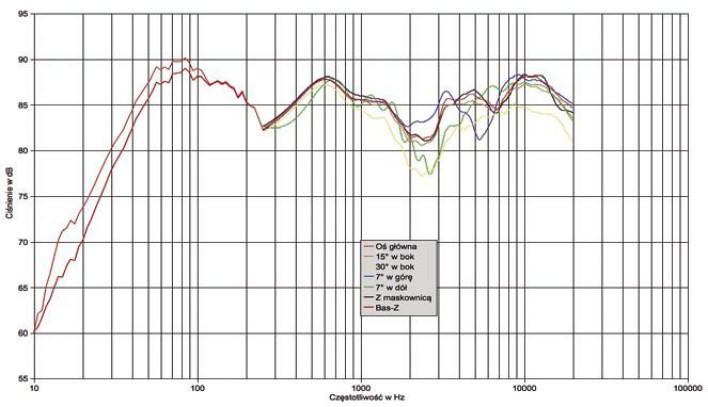 W sumie sytuacja jest jednak opanowana, dopóki pozostajemy w pobliżu osi głównej lub nieco powyżej - utrzymujemy się tam w deklarowanej ścieżce +/-3 dB. Siedząc niżej, odczujemy większe osłabienie w okolicach 3 kHz, co też nie musi być przykre - wycofanie tego zakresu jest czasami praktykowane z pełną premedytacją. W zakresie wysokich tonów widać delikatne uwypuklenie przy 10 kHz, łagodne opadanie przed samym skrajem pasma i dobre rozpraszanie; dopiero pod największym kątem 30O pojawia się różnica kilku decybeli. Maskownica nie ma w zasadzie żadnego wpływu.