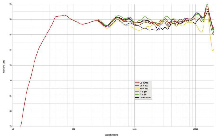 Charakterystyka przetwarzania na osi głównej, a także na osi -7º (w pionie) i 15º (w poziomie) osiąga najlepszą w tym teście liniowość +/- 1,5 dB w szerokim zakresie 45 Hz – 13 kHz; dopiero przy 15 kHz pojawia się szpic, który wymaga szerszej ścieżki +/-3 dB.