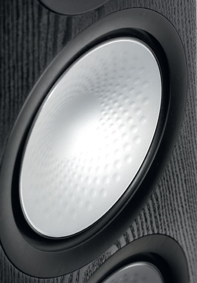 Kopułka wysokotonowa 25-mm również jest wykonana z C-CAM, ale już bez wgnieceń, za to z "pozłoceniem". Wokół kopułki utworzono krótki falowód zasłonięty wraz z nią wyprofilowanym w tym miejscu, fantazyjnie perforowanym panelem, jednocześnie integrującym wysokotonowy ze średniotonowym. Odległość między centrami akustycznymi tych przetworników wynosi tylko 8 cm (dwa razy mniej niż przy typowej konfiguracji z przetwornikiem 18-cm).