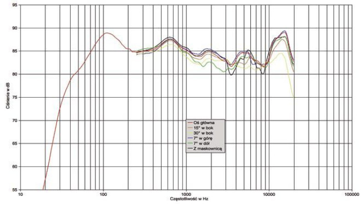 Najbardziej zastanawiające jest zafalowanie zakresu wysokich tonów, bo z pewnością osłabienie przy 8 kHz nie ma związku z częstotliwością podziału; to wrodzona cecha samego głośnika wysokotonowego (a może wpływ jego siateczki...). Na to nic nie poradzimy, ale problem jest lokalny, natomiast osłabienie 2-4 kHz możemy zredukować siadając dość wysoko - na osi +7O charakterystyka biegnie wyżej, albo zwiększyć na osi -7O. Z powodu tych osłabień, ich dalsze pogłębianie, jakie wprowadza maskownica, nie powinno być ignorowane, dlatego lepiej ją zdjąć.