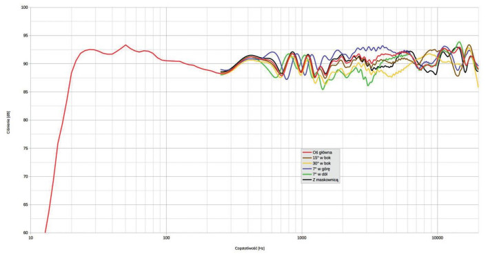 Producent podaje pasmo przenoszenia (całego zespołu) dwukrotnie – na osi głównej i pod kątem 30º (nie precyzując, w jakiej płaszczyźnie, ale chyba można przyjąć, że w poziomej), w obydwu przypadkach dla wąskiej ścieżki +/-2 dB – ambitnie! Różnica wynikająca ze zmiany osi, i to niewielka, dotyczy oczywiście wyłącznie górnej częstotliwości granicznej, która obniża się z 23 kHz do 20 kHz.